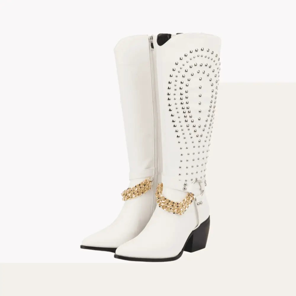 8 cm'den fazla yüksekliğe sahip extra yüksek blok topuk ve sivri burun tasarımıyla her kıyafet için mükemmel bir arkadaş. Lastik taban, mükemmel bir tutuş sağlarken, perçin detayları trend bir vurgu oluşturur.