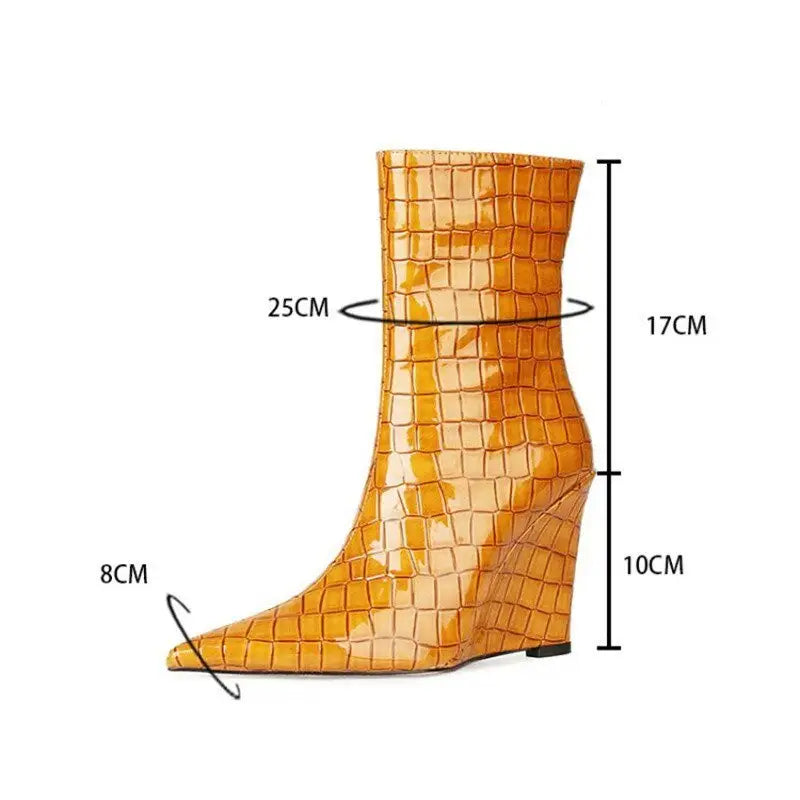 İnce burun ve extra yüksek blok topuk (8 cm'den fazla) ile etkileyici bir bacak uzatma sağlar; orta buzağı yüksekliği ise şık bir görünüm sunar.