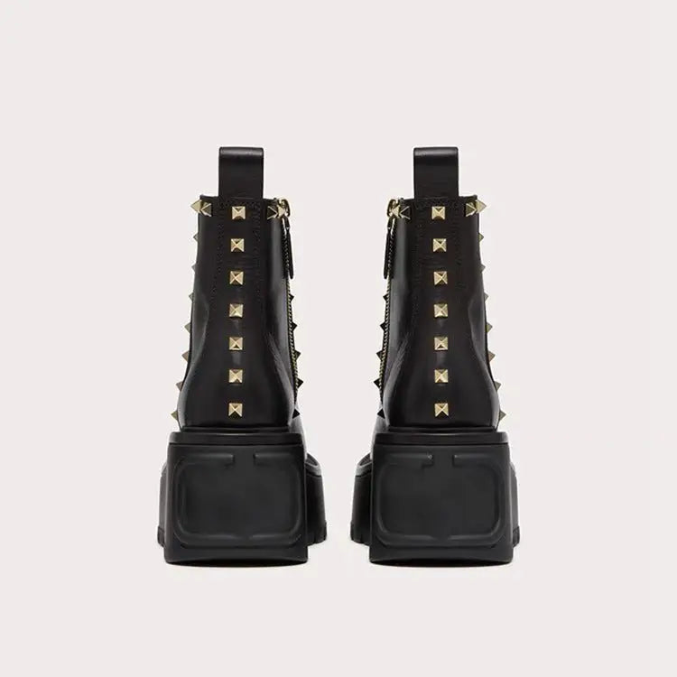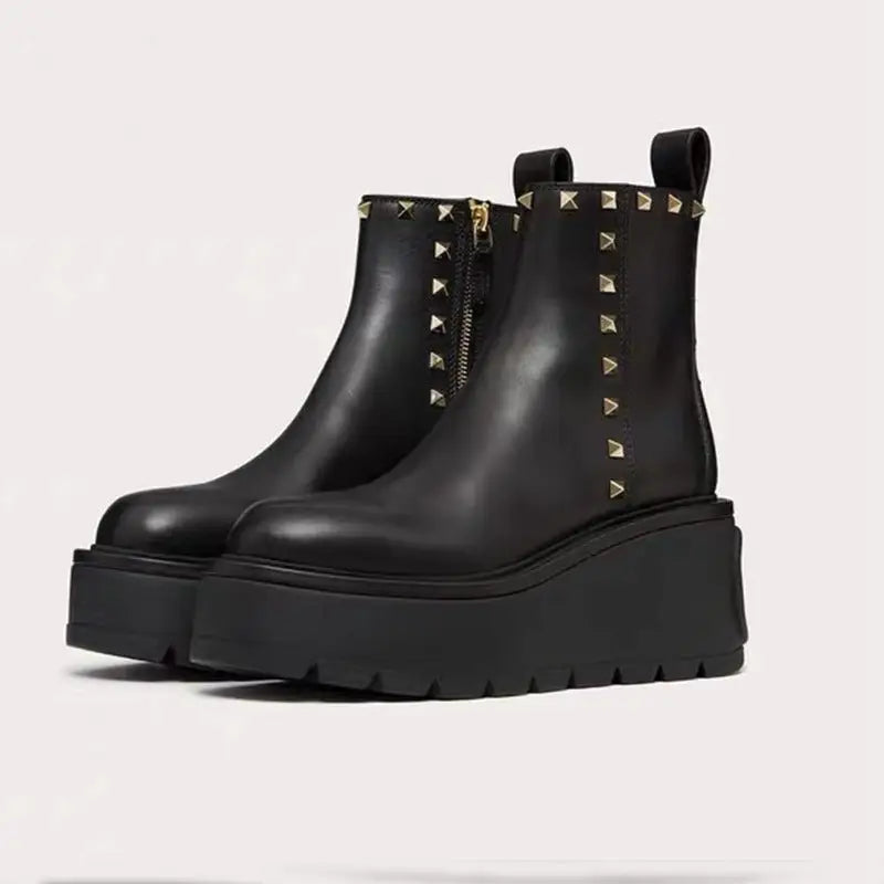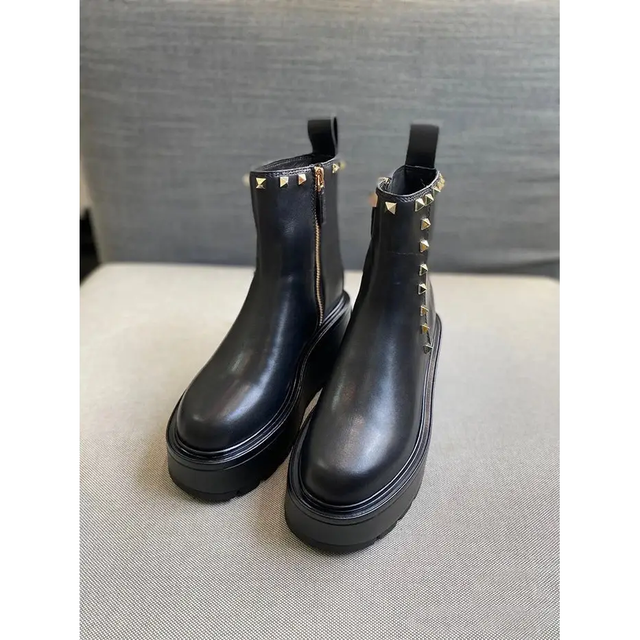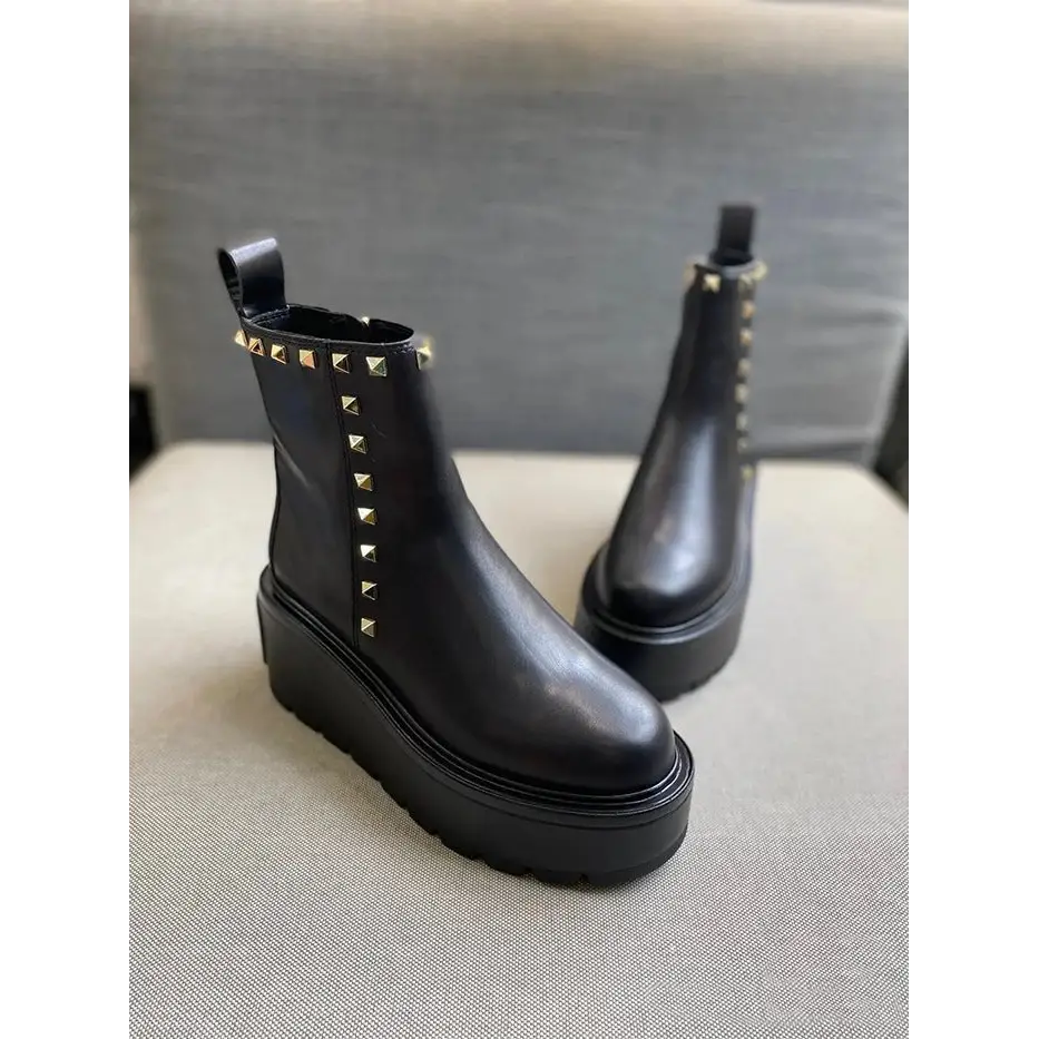 Yuvarlak burun ve kalın topuk (6–8 cm) bacaklarınızı görsel olarak uzatırken, alçak şaft ek konfor sağlar. Modern metal detaylar, nakışlar ve perçinler ile bu tek renkli bot, gerçekten dikkat çekicidir.